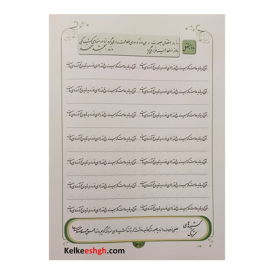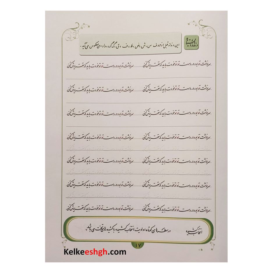 این مجموعه ارزشمند توسط استاد مهدی شیخ ربیعی با هدف آموزش خوشنویسی با خودکار تدوین شده است. کتاب حاضر علاوه بر تمرینات معمول که در کتابهای دیگر هم وجود دارد حرکت نوآورانه ای به انجام رسانده و مطالب و نکات فنی خوشنویسی را در قالبی بسیار ساده و مختصر در جدول پایین هر صفحه ارائه نموده است. مزیت دیگر کتاب ترتیب و توالی از ساده به سخت سطرها می باشد که هنرجو را آرام آرام وارد فضای حرفه ای خوشنویسی می نماید.