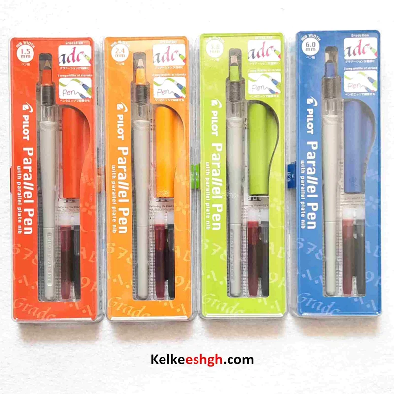 اگر شما هم به خوشنویسی غیرفارسی علاقه دارید و نمیخواهید به شیوه سنتی از دوات و لیقه و مرکب و سایر ابزارهای خوشنویسی با قلم استفاده نمایید پیشنهاد میکنیم حتما قلمهای پارالل پایلوت (Pilot) را تهیه نمایید. این قلم همانند خودنویس دارای یک مخزن جوهر است که هر بار جوهر آن به اتمام رسید می توانید دوباره آن را شارژ کنید یا اینکه می توانید از کارتریجهای آماده پایلوت بهره ببرید. قلم های پارالل پایلوت با طراحی منحصر به فرد خود برای شروع خوشنویسی بسیار مناسب است و علاوه بر اساتید به هنرجویان نیز توصیه میشود. قلم کالیگرافی پایلوت ابزاری بی نظیر و بی رقیب برای خوشنویسان و طراحان و گرافیستها محسوب میشود که توسط شرکت ژاپنی پایلوت تولید شده است. قلمی بسیار کارآمد در چهار ضخامت نوک مختلف که بر اساس ضخامت نوک رنگ بدنه این محصول تغییر میکند. درون بسته این محصول (با هر ضخامتی) دو عدد کارتریج و درب محصول تعبیه شده است.