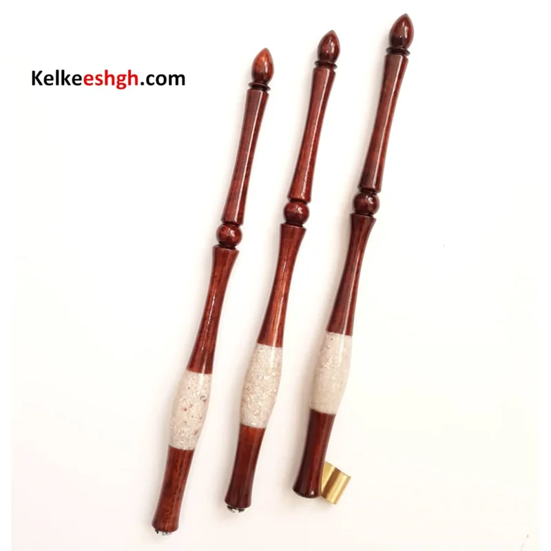 یکی از مهم ترین ابزار در خوشنویسی انگلیسی دسته قلم یا Holder می باشد که خوشنویسی بسیاری از سبکهای انگلیسی و لاتین بدون آن عملا امکان پذیر نیست. دسته قلمها عموماً به دو شکل هستند و مهم ترین تفاوت دسته قلم های دیپ و آبلیک در نحوه اتصال نوک فلزی به خود است. نوک فلزی در دسته قلمهای دیپ، هم راستا با دسته قلم در آن قرار میگیرد به طوری که دسته قلم و نوک فلزی در یک راستا قرار میگیرند. اما در دسته قلمهای آبلیک، نوک فلزی به صورت زاویه دار به آن متصل میشود. یعنی نوک فلزی با زاویه حدودا ۵۰ درجه در یک گیره فلزی که خود به دسته قلم متصل است قرار میگیرد. بنا به تقاضای شما همراهان عزیز، فروشگاه کلک عشق به عنوان بزرگترین واردکننده محصولات هنری و خوشنویسی از سال 1399 عرضه و تولید محصولات مربوط به خوشنویسی لاتین را نیز در دستور کار قرار داده و سعی دارد پاسخگوی نیاز شما عزیزان در این زمینه باشد. دسته قلم حاضر از چوب با کیفیت گردو تولید شده است و تکههای صدف دریایی زیبایی دوچندانی به آن بخشیده است.