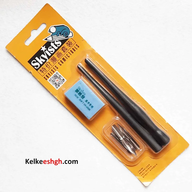 یکی از مهم ترین ابزار در خوشنویسی انگلیسی دسته قلم یا Holder می باشد که خوشنوسی بسیاری از سبکهای انگلیسی و لاتین بدون آن عملا امکان پذیر نیست. از هولدر یا دسته قلم به منظور نگه داشتن نوک فلزی استفاده میکنند. در اینجا به معرفی قلم فلزی skyists مدل CTM-008 خواهیم پرداخت.این مجموعه شامل ۵ نوک فلزی در سایزهای مختلف ( Round Nib- Student Nib- D Nib- Hard G Nib – Soft G Nib ) به همراه دو دسته پلاستیکی با فرم متفاوت میباشد که به راحتی میتوانید از هر ترکیبی که بخواهید از این مجموعه بهره ببرید. این مجموعه دارای یک پاک کن به رنگ فیروزهای نیز میباشد. این محصول برای کارتونیستها و هنرمندانی که به دنبال ایجاد خط خوب، و الفبای نقاشی و خط یکنواخت هستند نیز بسیار مناسب است. بنا به تقاضای شما همراهان عزیز، فروشگاه کلک عشق به عنوان بزرگترین واردکننده محصولات هنری و خوشنویسی از سال 1399 عرضه و تولید محصولات مربوط به خوشنویسی لاتین را نیز در دستور کار قرار داده و سعی دارد پاسخگوی نیاز شما عزیزان در این زمینه باشد.